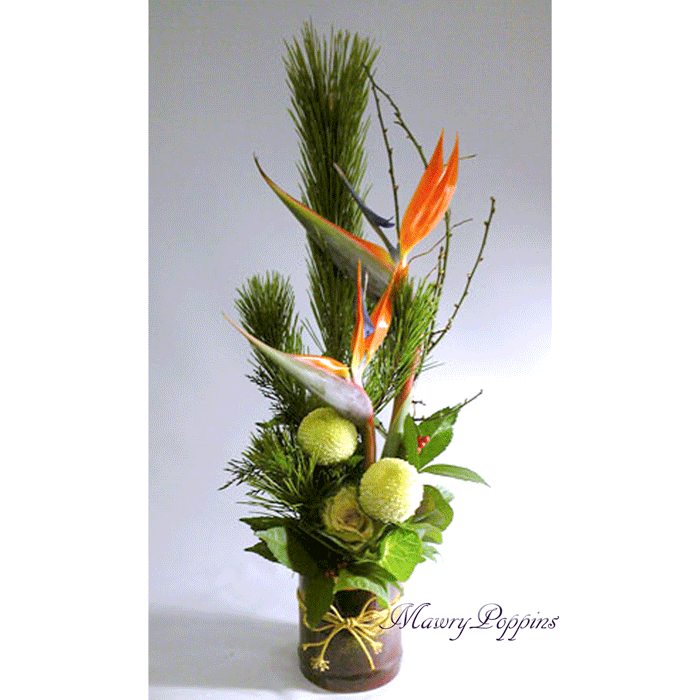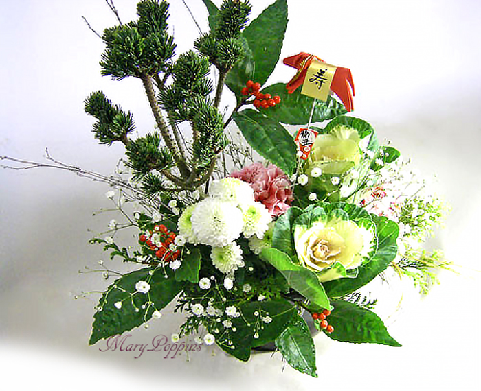 寿松、ストレリチア、梅、千両、葉牡丹、ピンポンマム