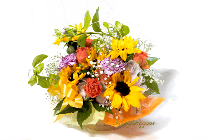 ヒマワリ、バラ、トケイソウ(パッションフルーツ)、シンビジウム、カーネーション、黄実千両